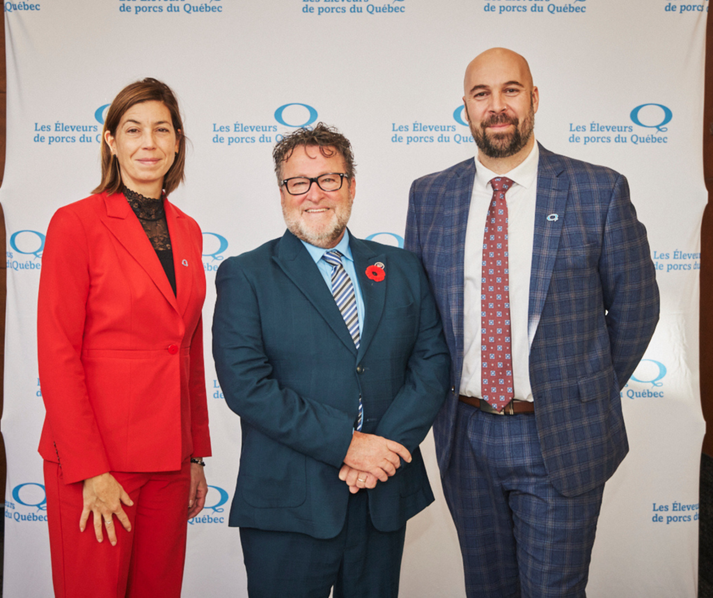 Sophie Perreault, directrice générale des Éleveurs de porcs du Québec; Donald Martel, ministre de l’Agriculture, des Pêcheries et de l’Alimentation; Louis-Philippe Roy, président des Éleveurs de porcs du Québec