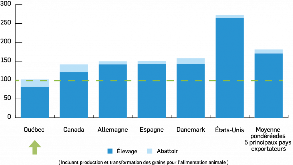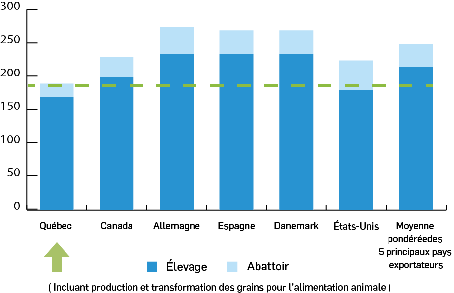 Le bilan de GES de la production porcine québécoise est l’un des plus performants au monde. Selon les données de la WFLDB 3.5 (2020), le bilan de GES de la production de porcs au Québec est 25 % inférieur au bilan de GES moyen des cinq principaux pays exportateurs de porcs (États-Unis, Allemagne, Espagne, Danemark, Canada). Ce résultat s’explique en partie par les conditions climatiques qui contribuent à réduire les émissions de GES liées à l’entreposage du lisier et par l’utilisation de l’hydroélectricité produite au Québec.